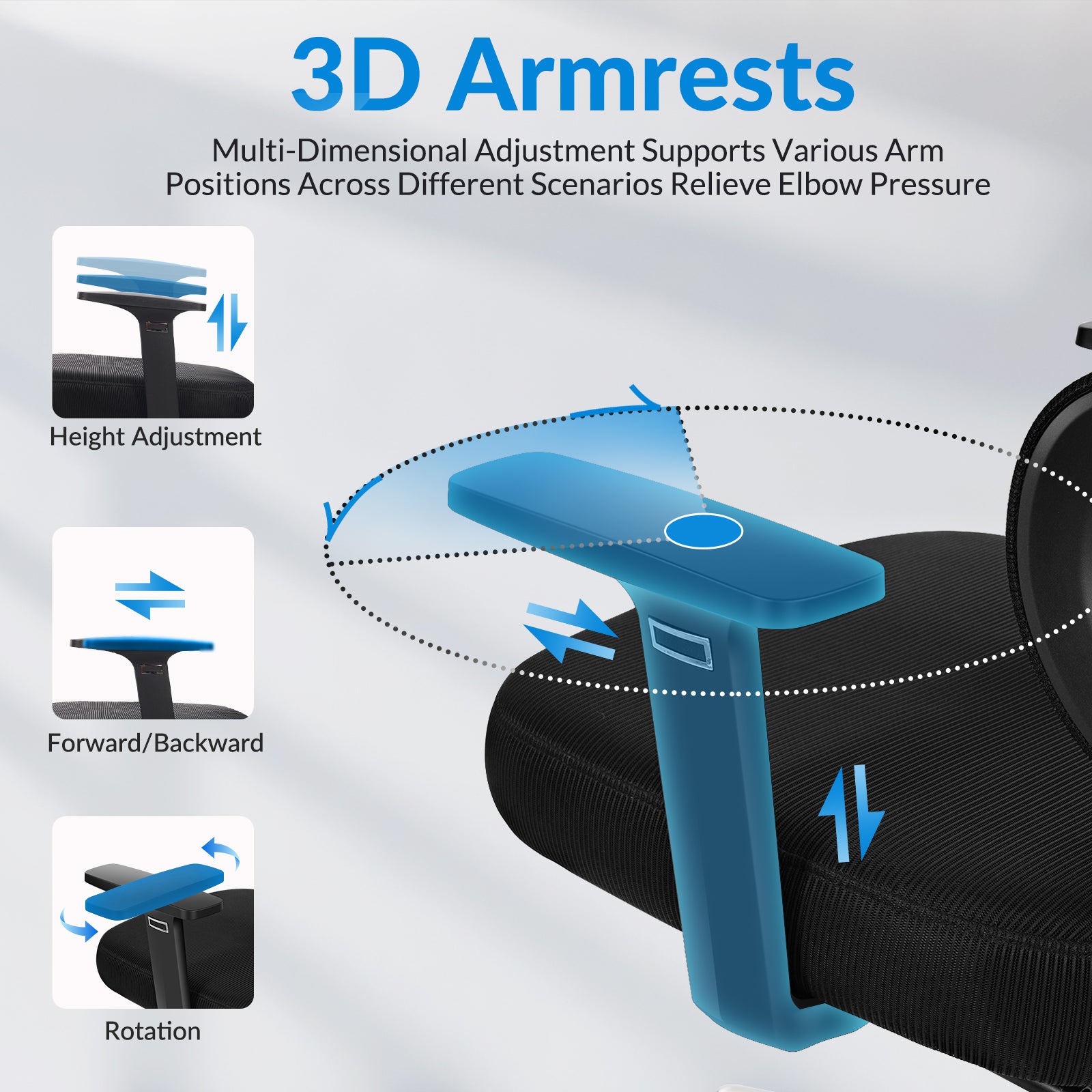 A: The 3D armrests can be adjusted up/down, forward/backward, and angled inward/outward. This flexibility ensures optimal arm and shoulder alignment, especially when typing or using a mouse.