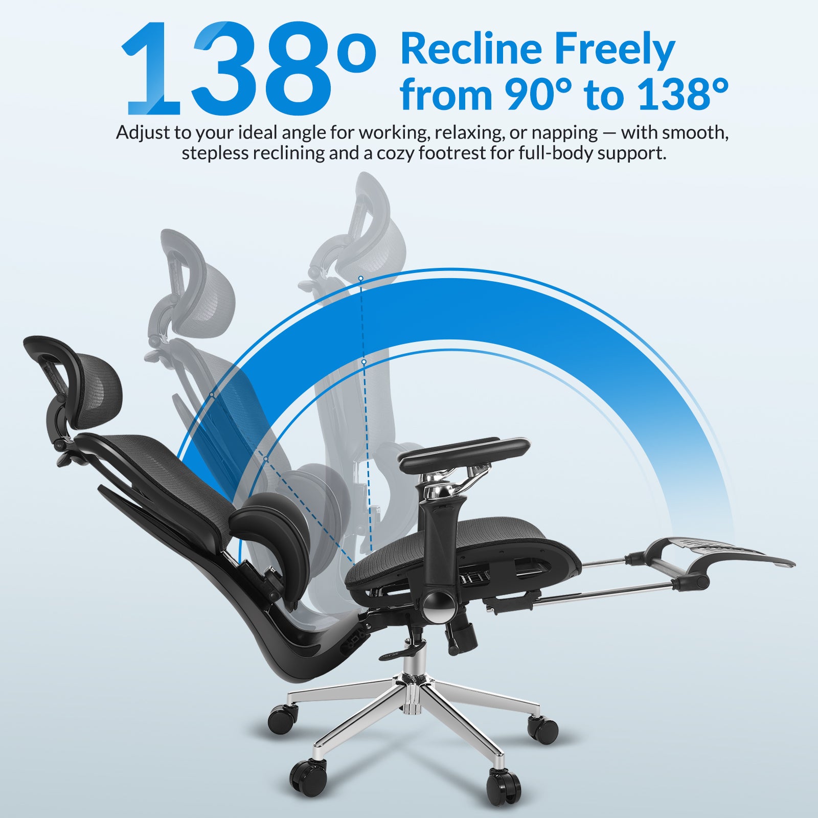 Lean back smoothly with a 90°–135° adjustable recline and integrated footrest. Ideal for switching between intense focus and restorative breaks, it supports full-body relaxation without compromising posture.